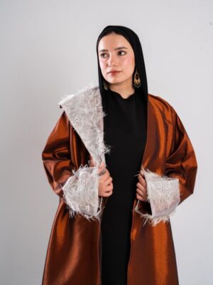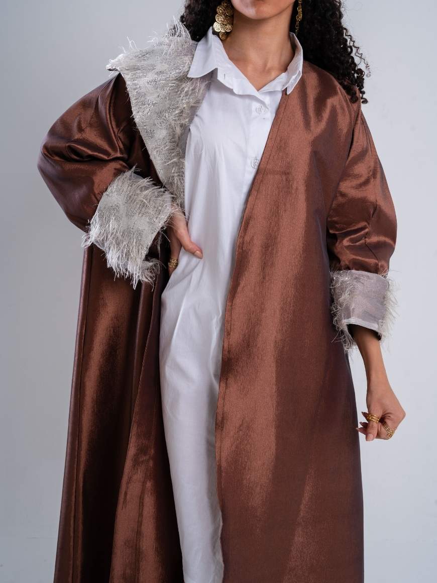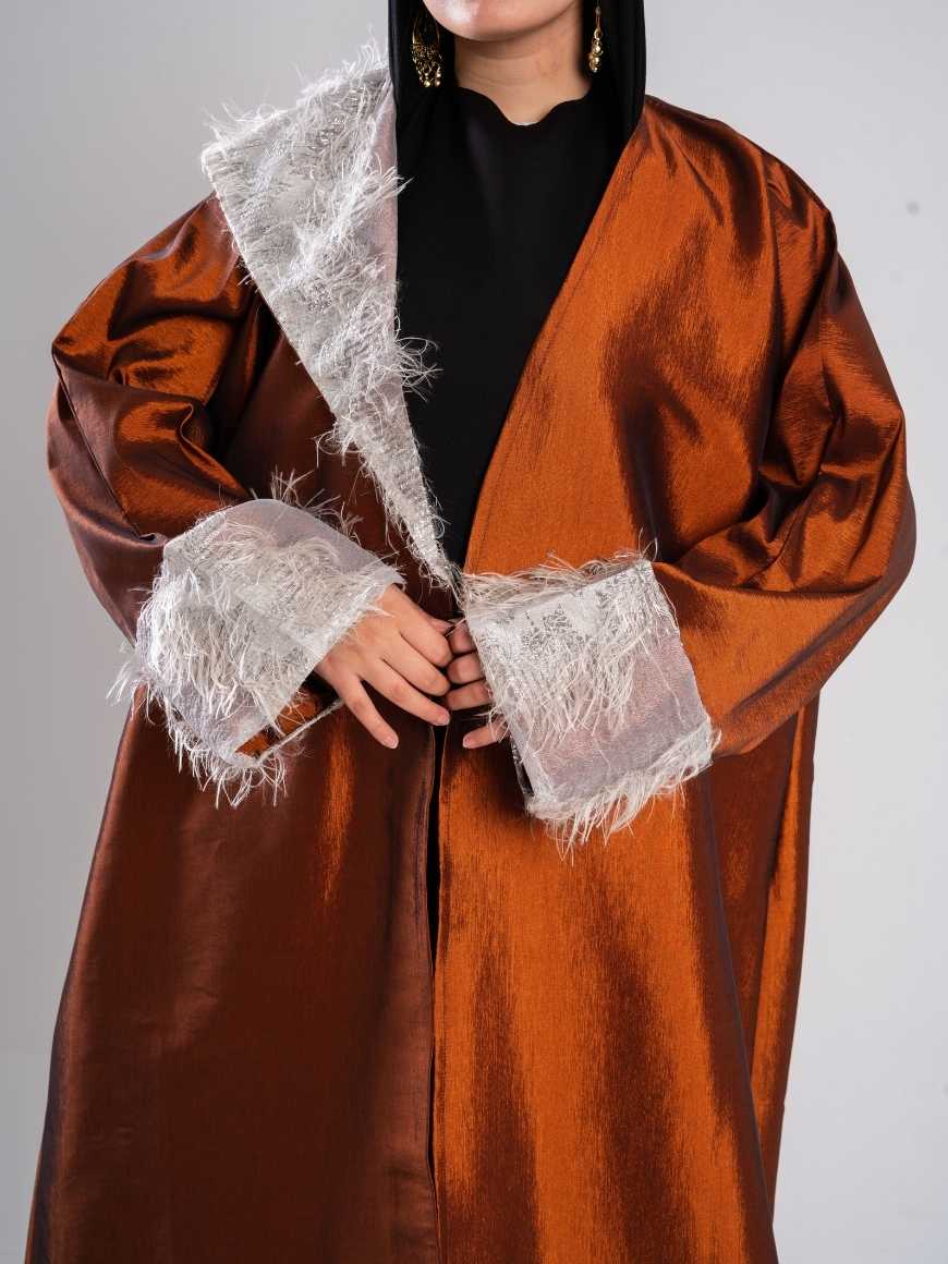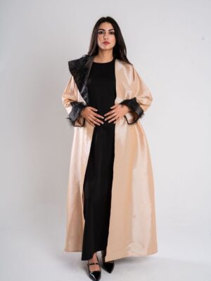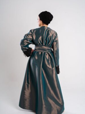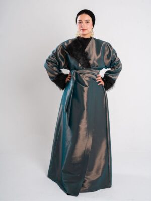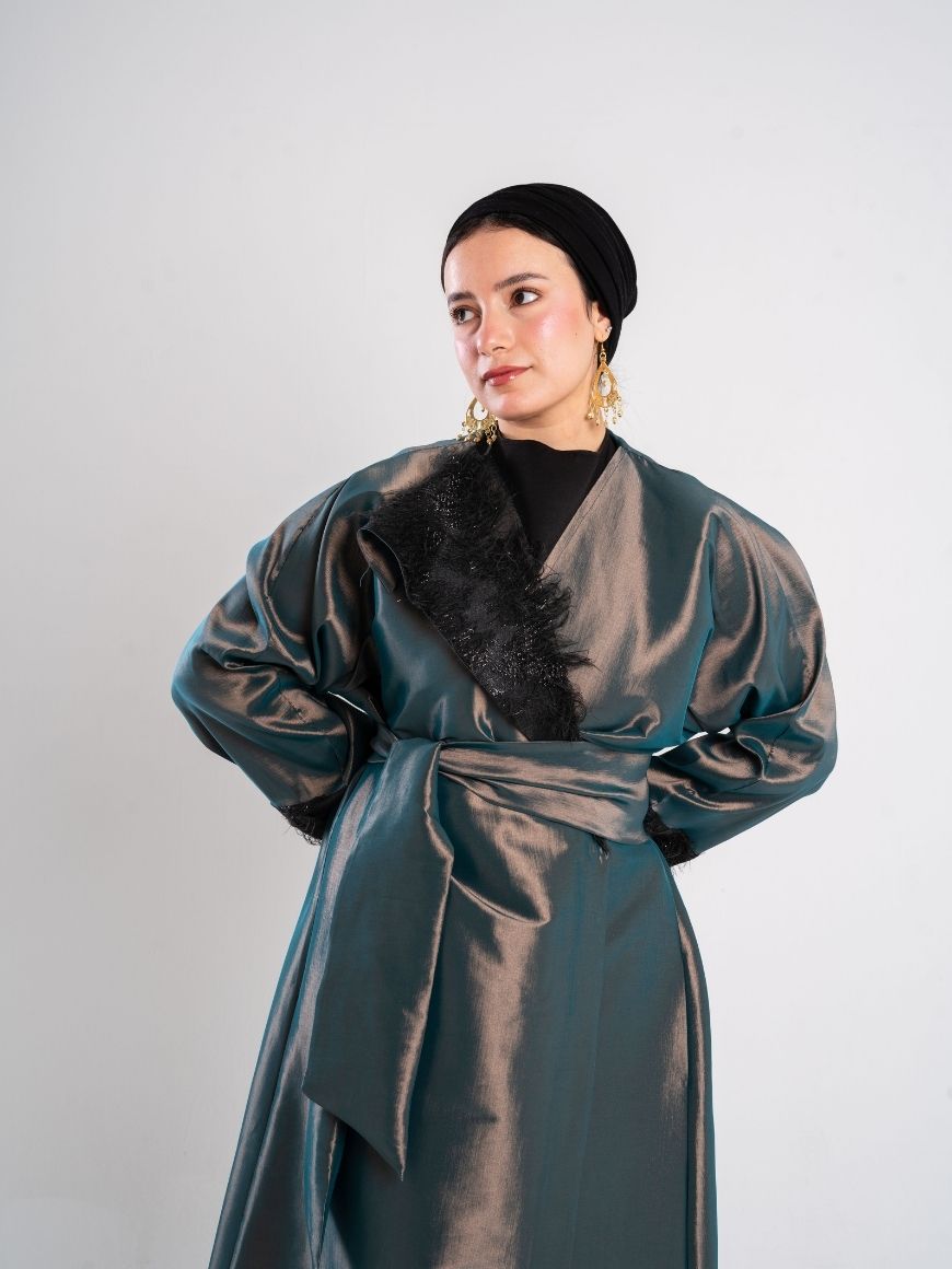 feathered sided kaftan and sleeves with a flattering waist tie