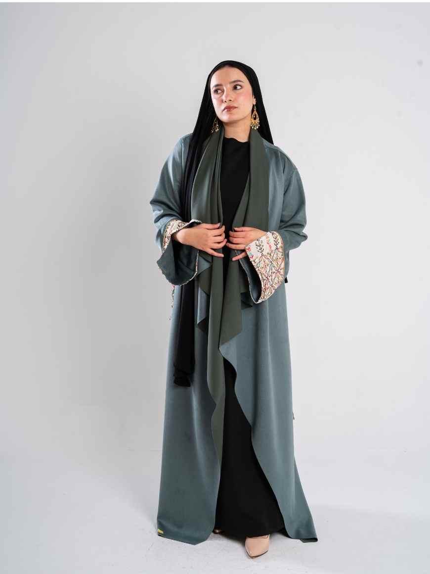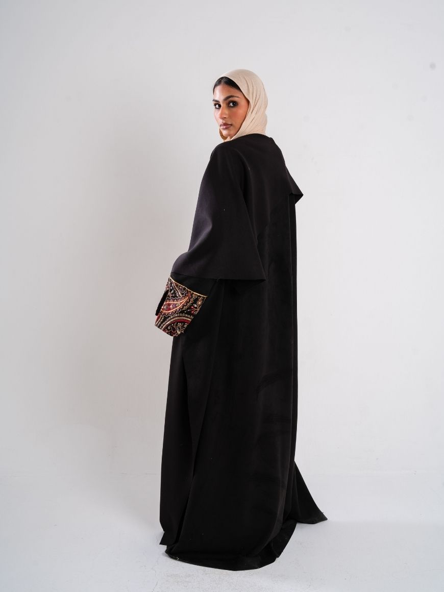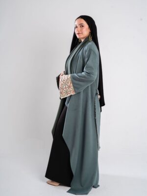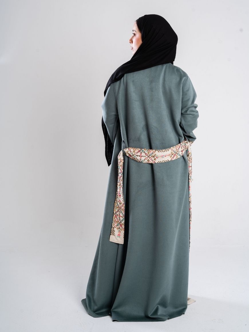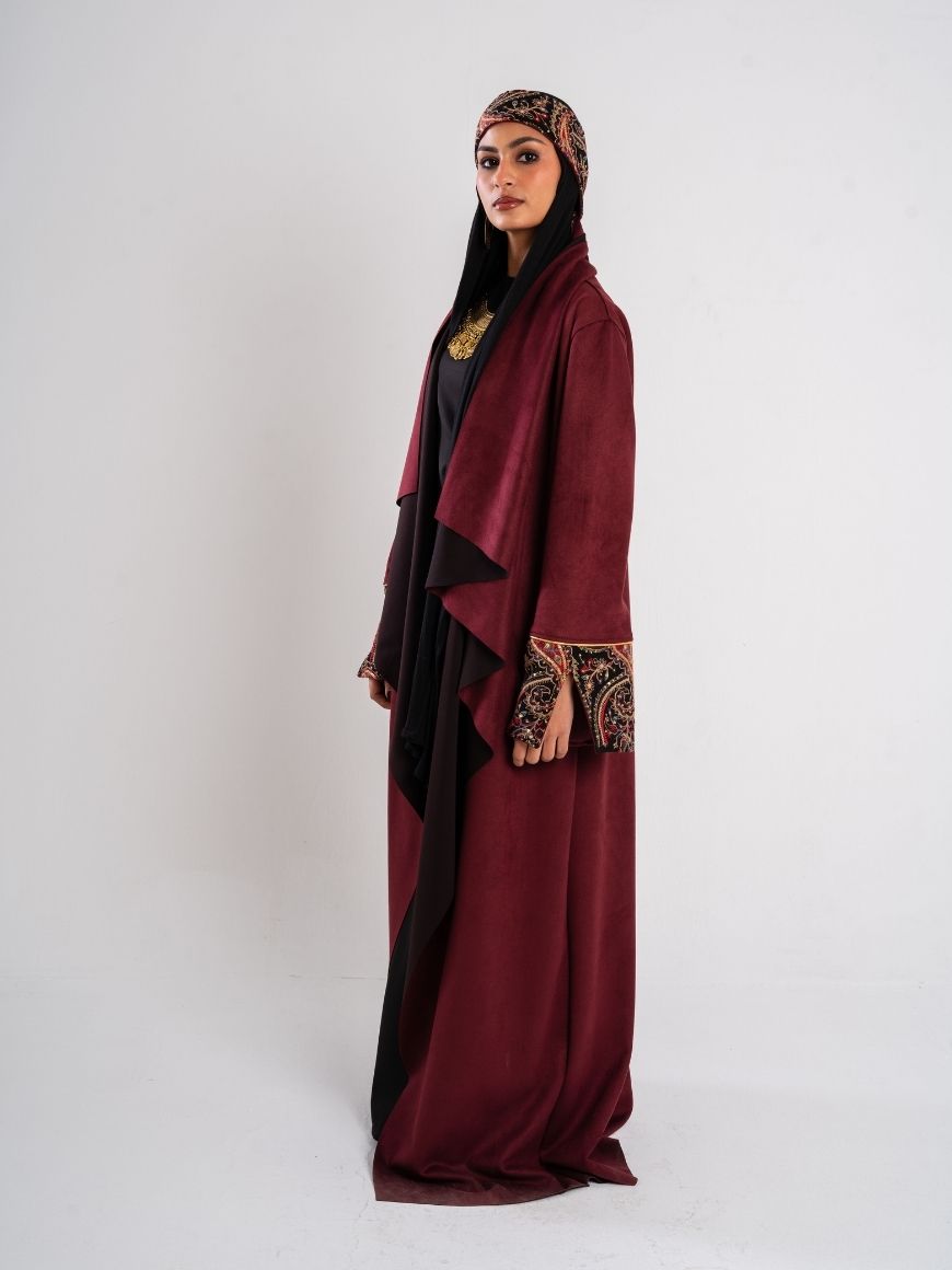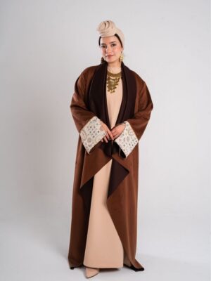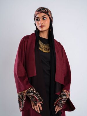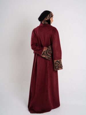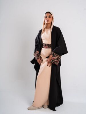 Description: Swedish kaftan with sequined sleeves and ruffled neck shape with a sequined belt
