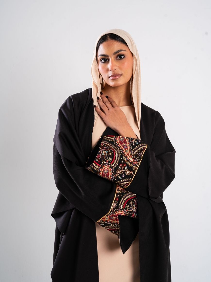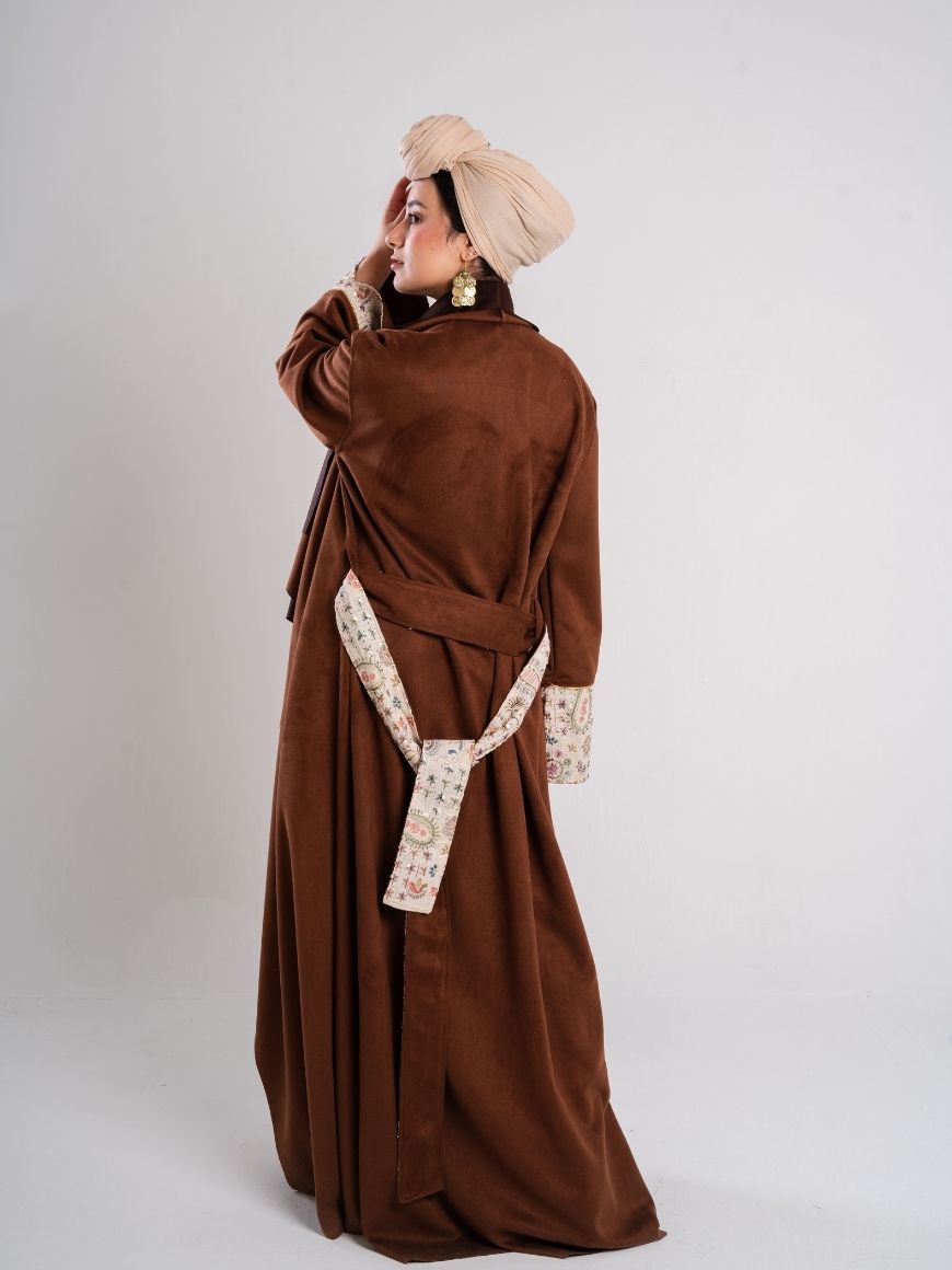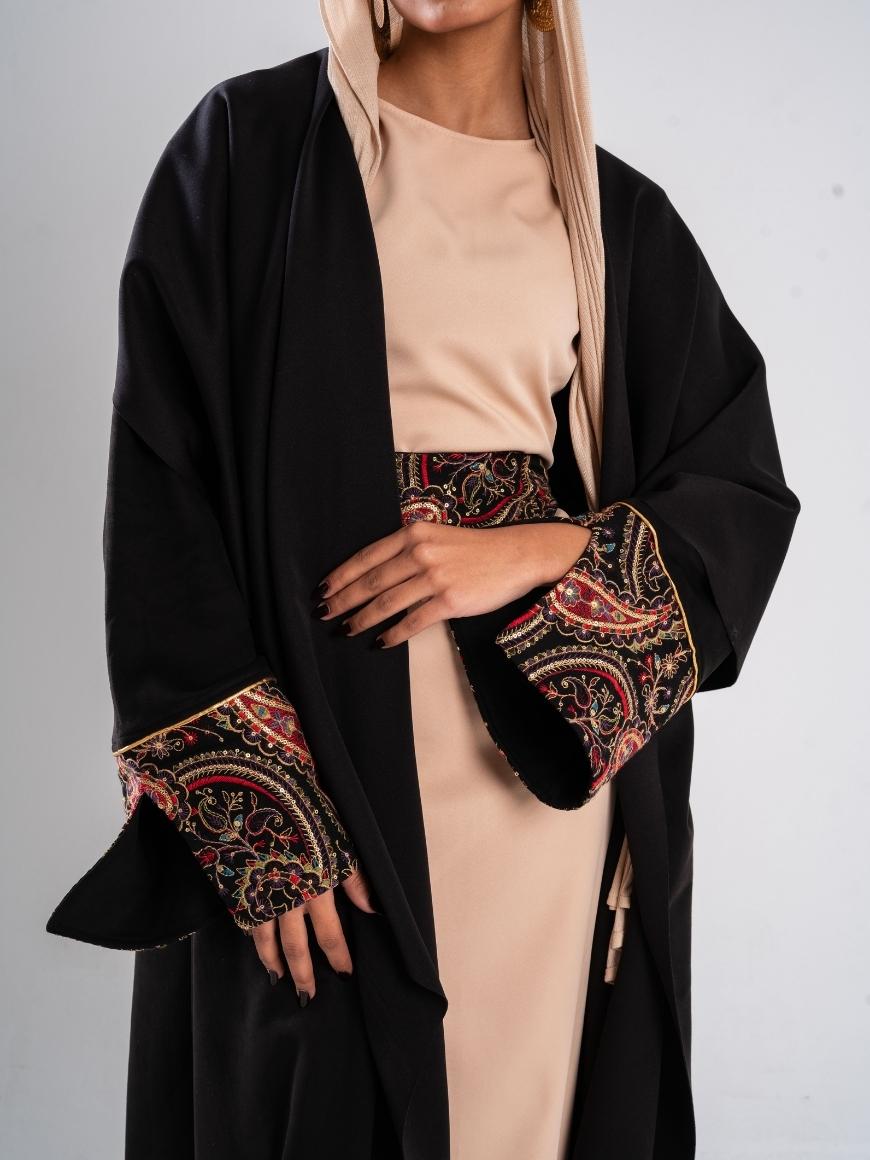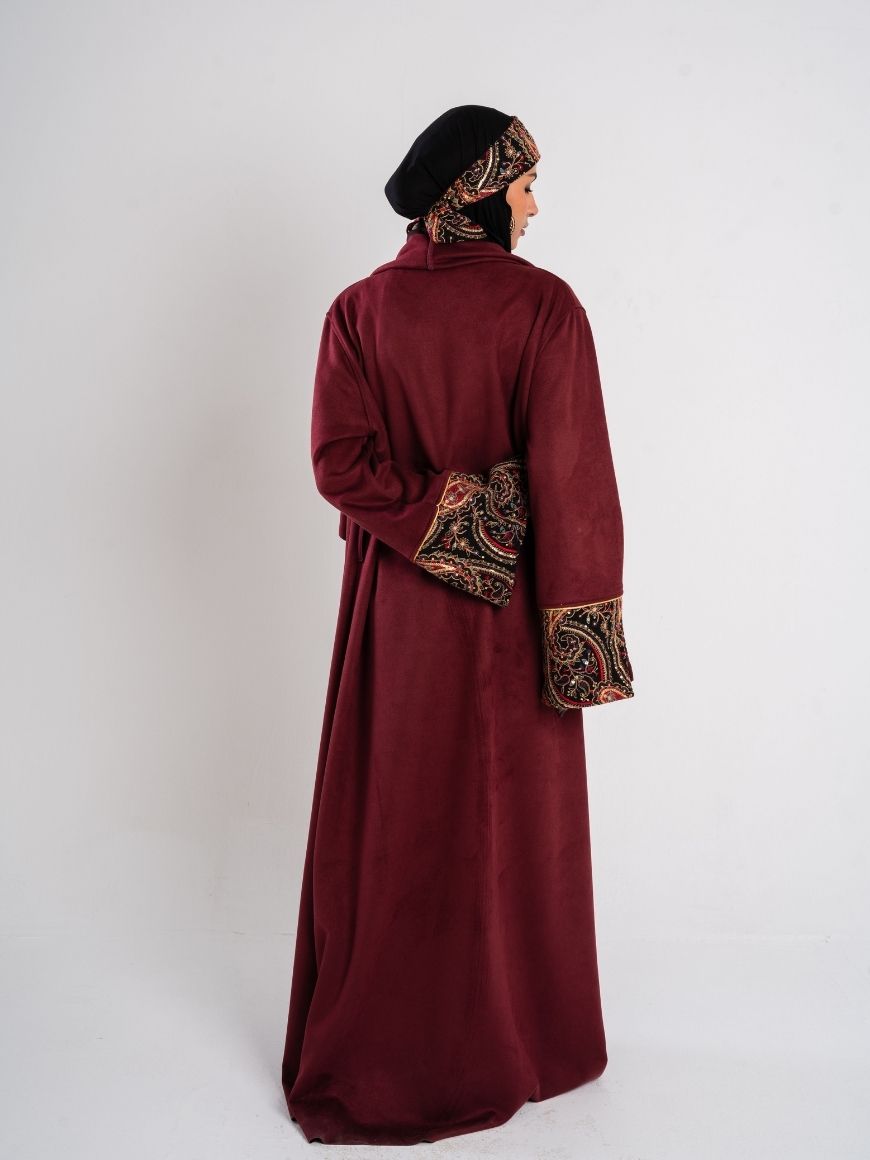 Swedish kaftan with sequined sleeves and ruffled neck shape with a sequined belt