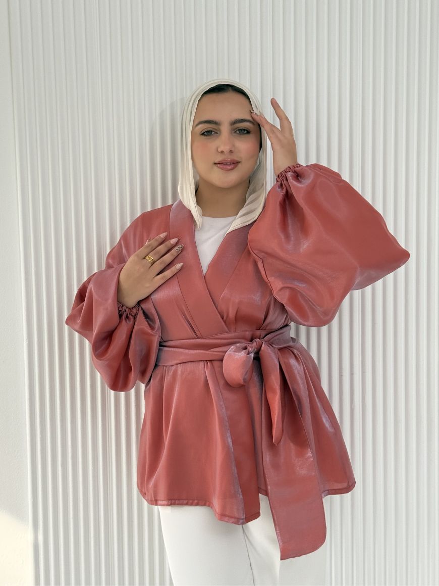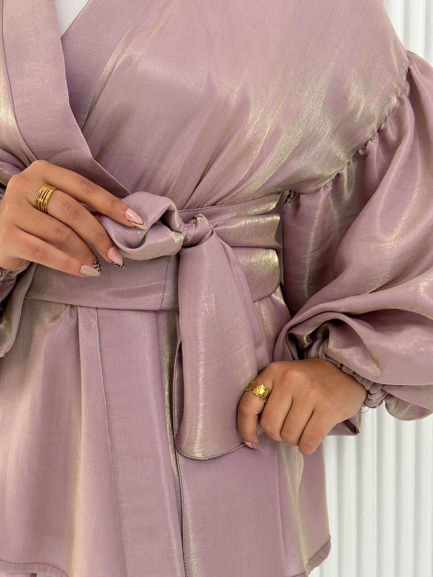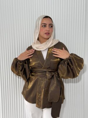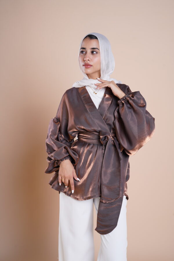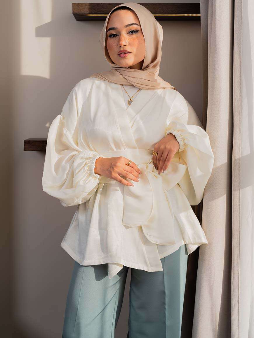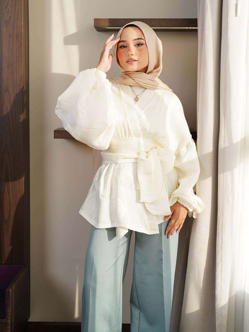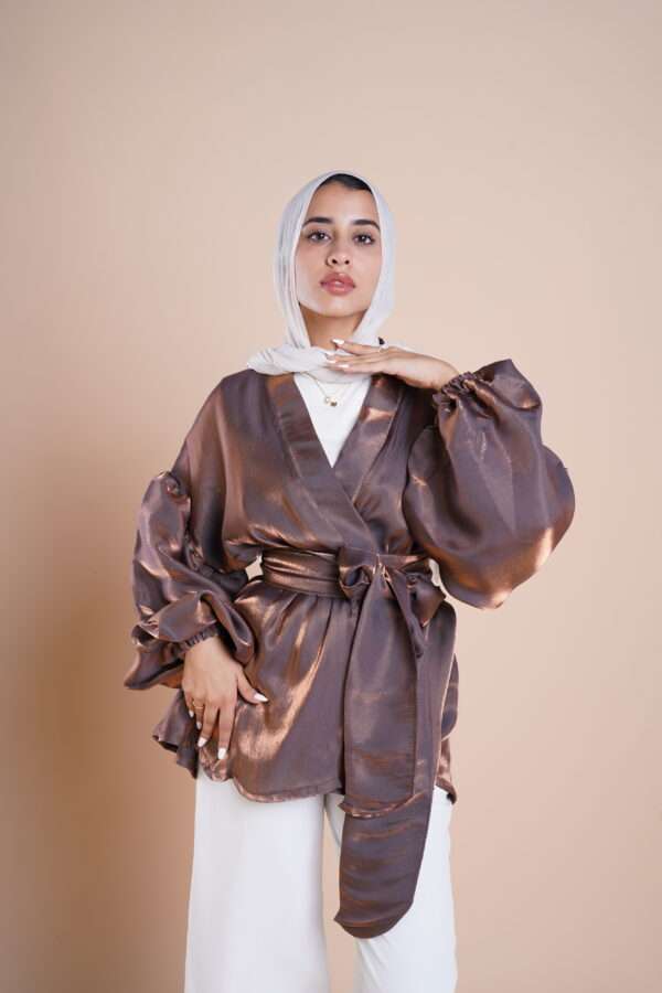 Flowered shape blouse with belt and puffy sleeves