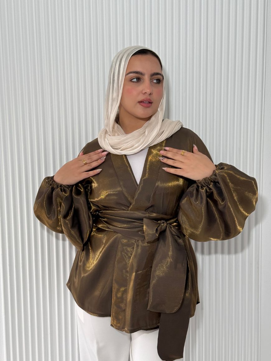 flowered shape blouse with belt and puffy sleeves