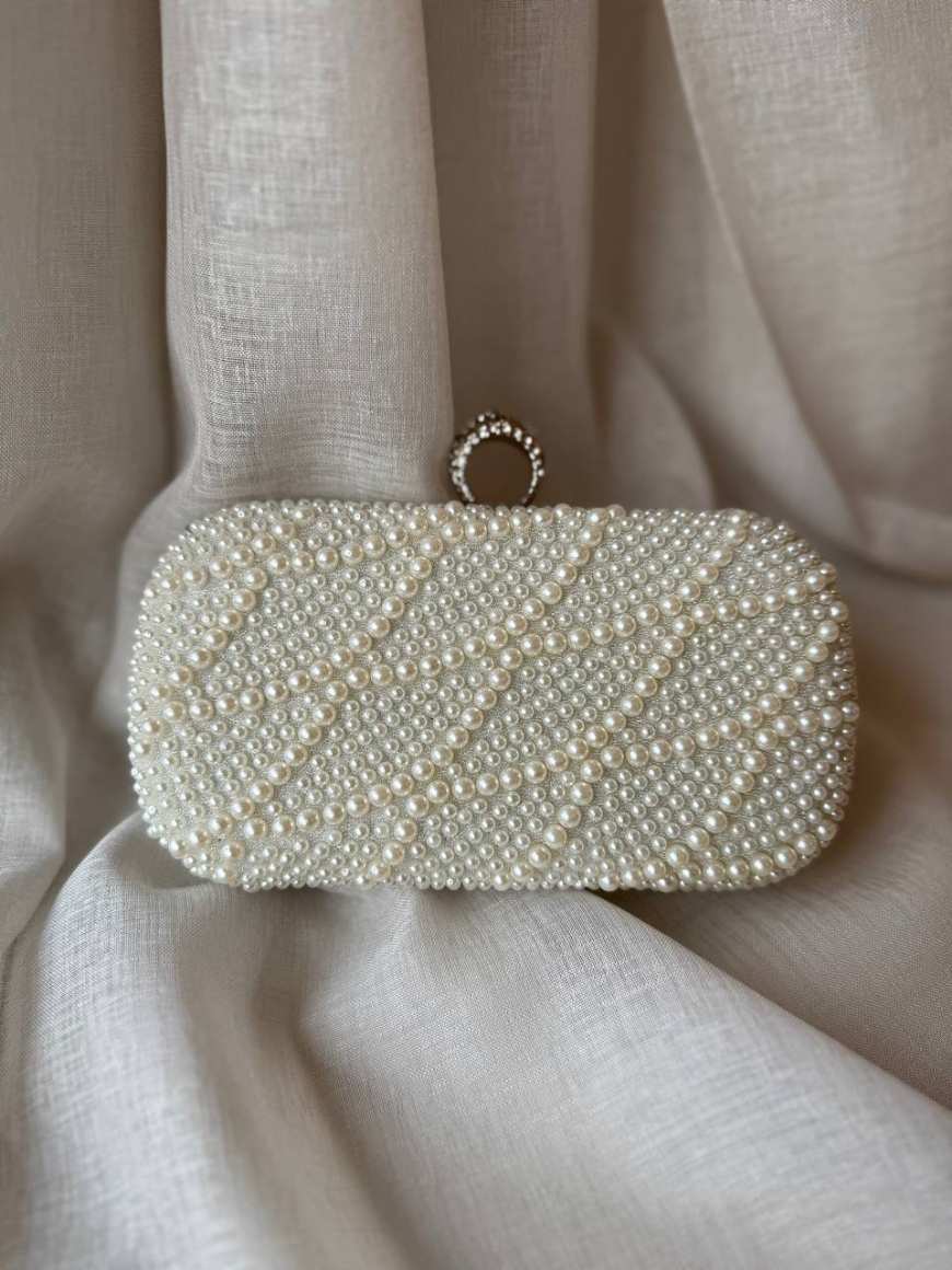 Make a statement with this radiant clutch bag featuring a luxurious wave design made entirely of pearls.